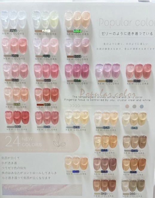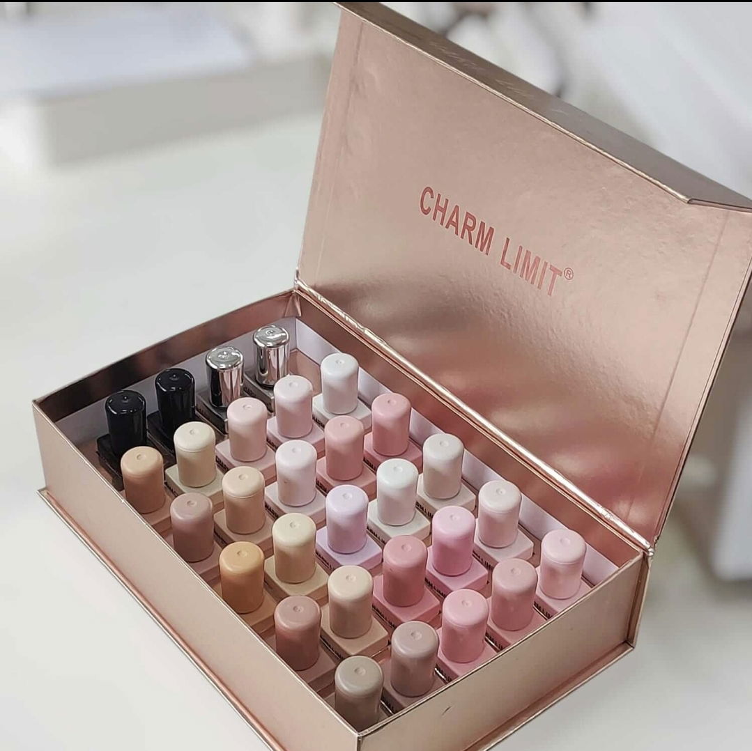1 top coat clásico y 1 top cristal y 25 colores nude y rosas translúcido.