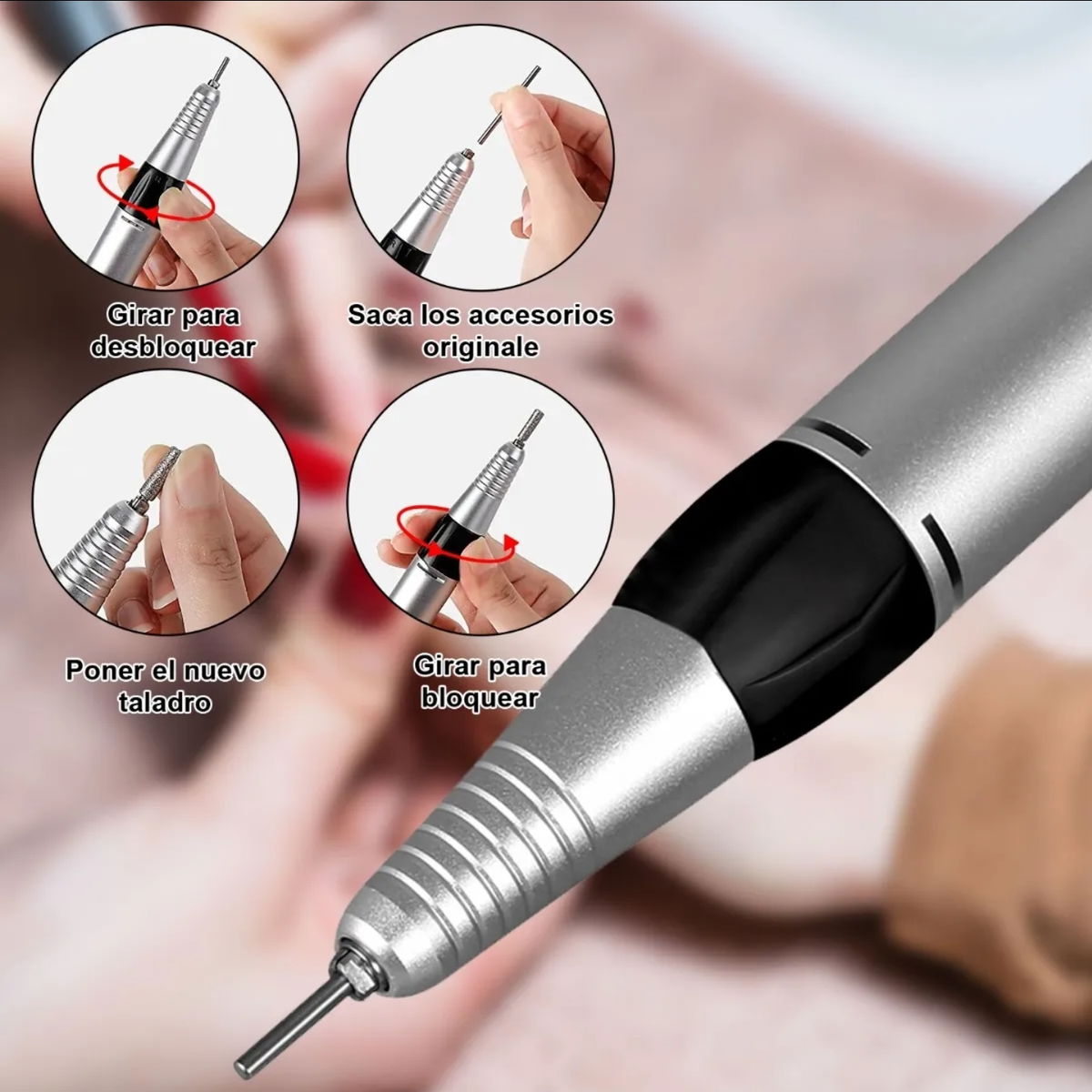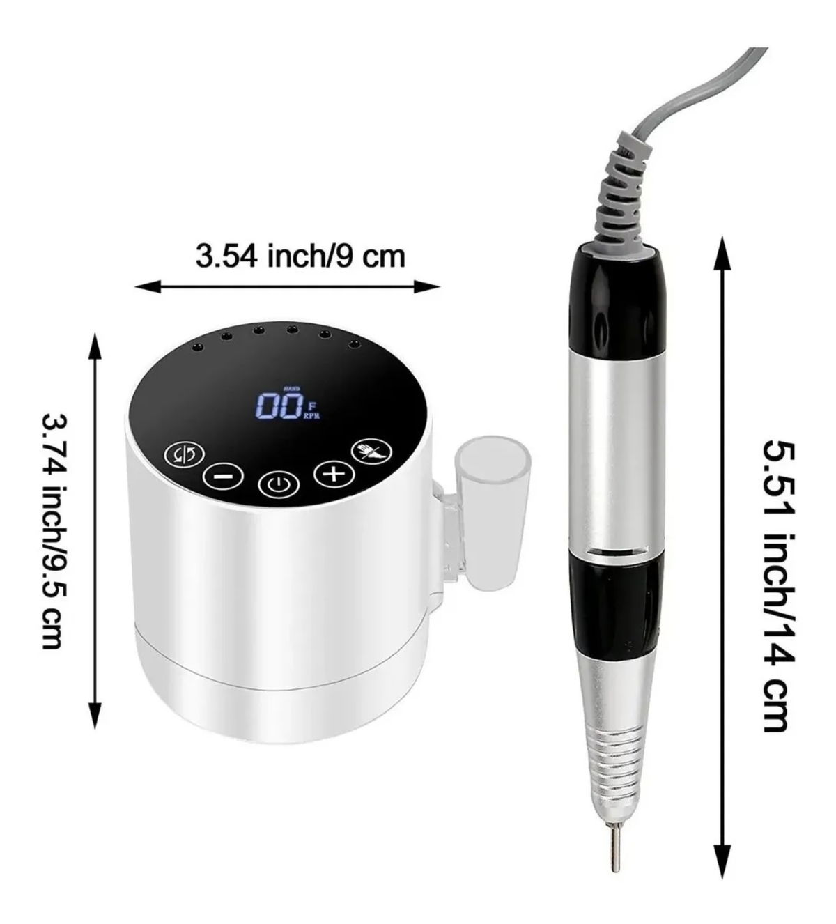 Torno Digital de cuerpo compacto de baja vibracion y bajo ruido. Con control de velocidad de 0 a 35.000RPM, 50W 50/60Hz -220V Cuenta con reversa, pedalera, kit de fresas para manicura rusa, soporte para lapicera y cable de alimentacion sus medidas de 9cm de diamentro x 9,5 cm lo vuelven de facil traslado