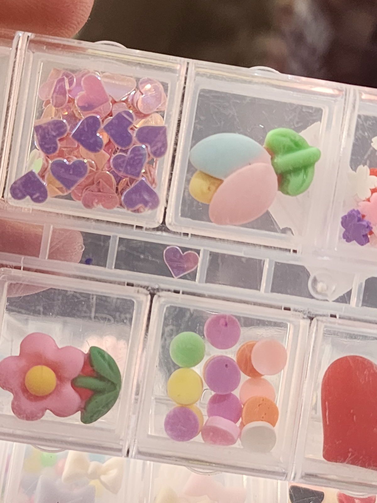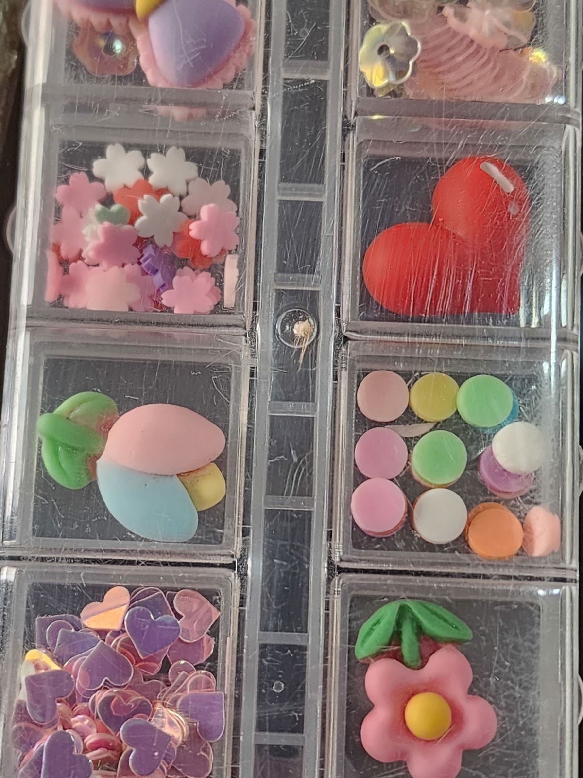 Cajas de 12 compartimento mezcla de dijes , fimos, strass, caviar, etc
