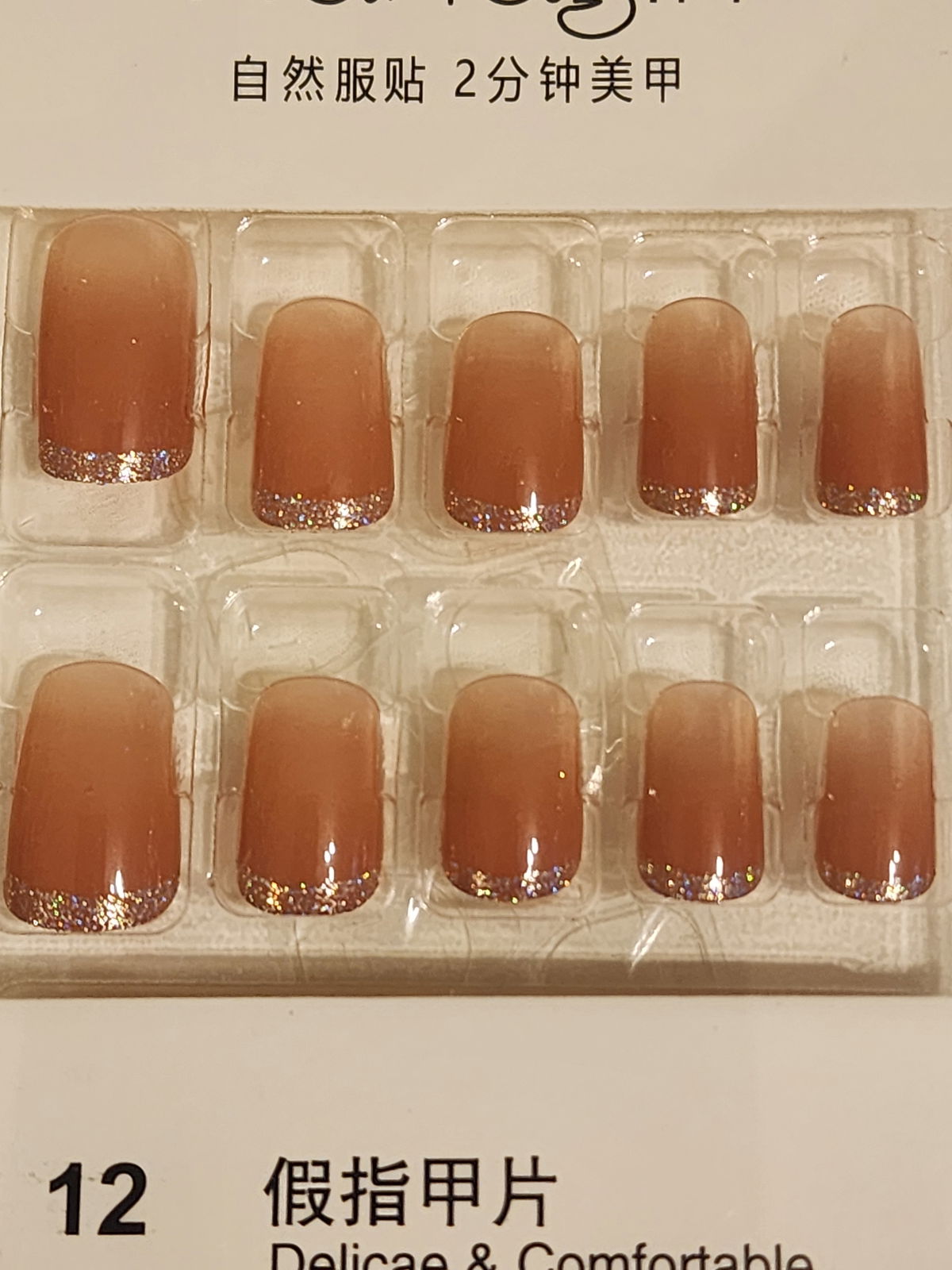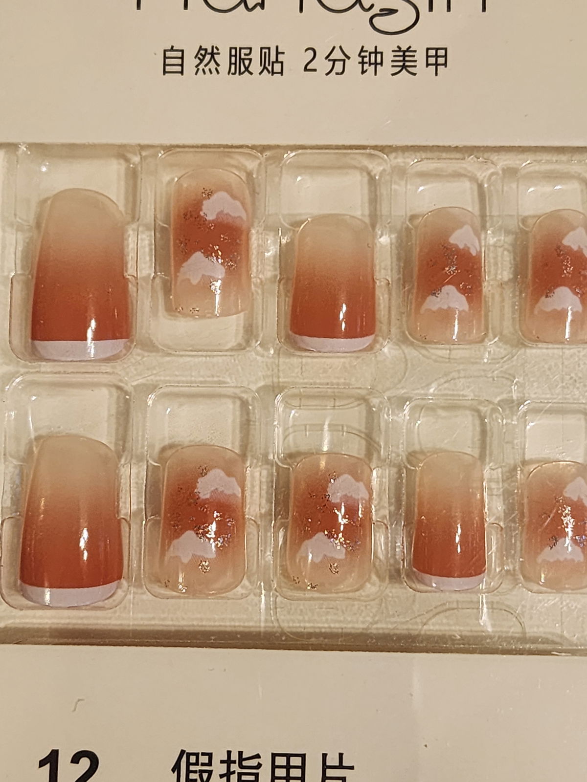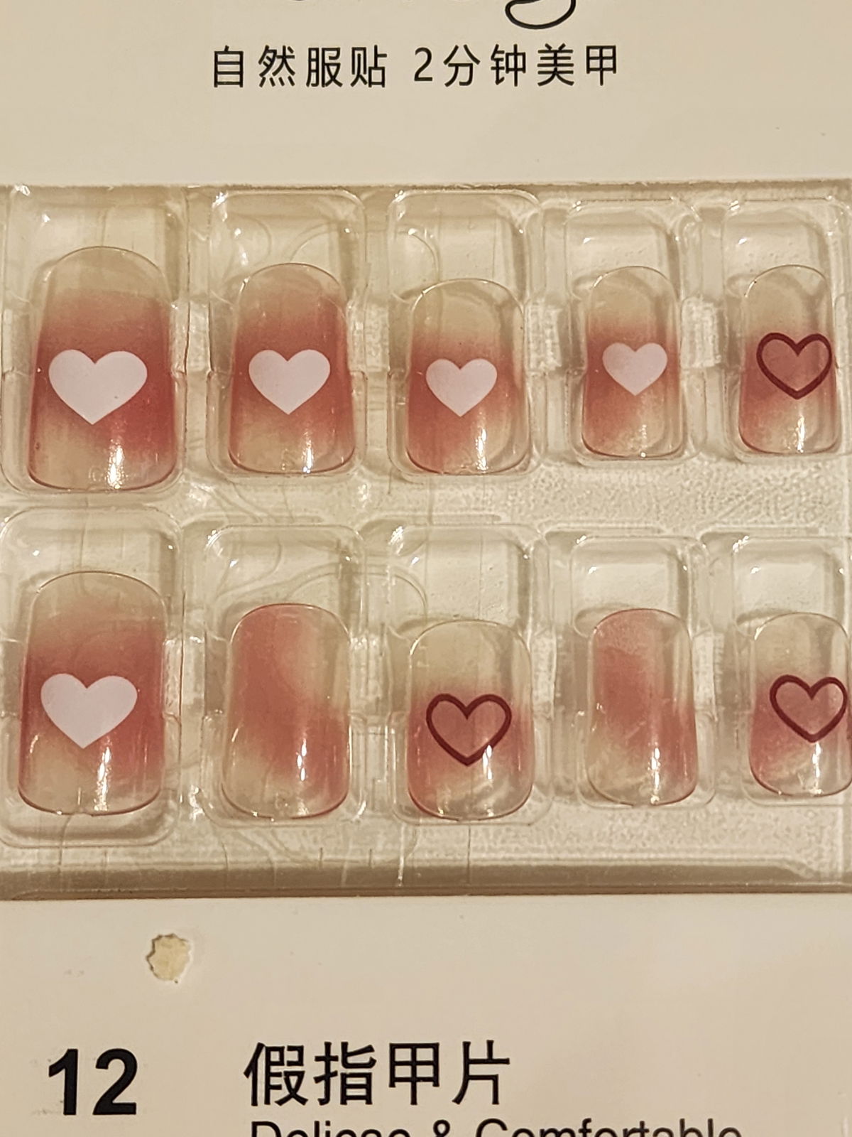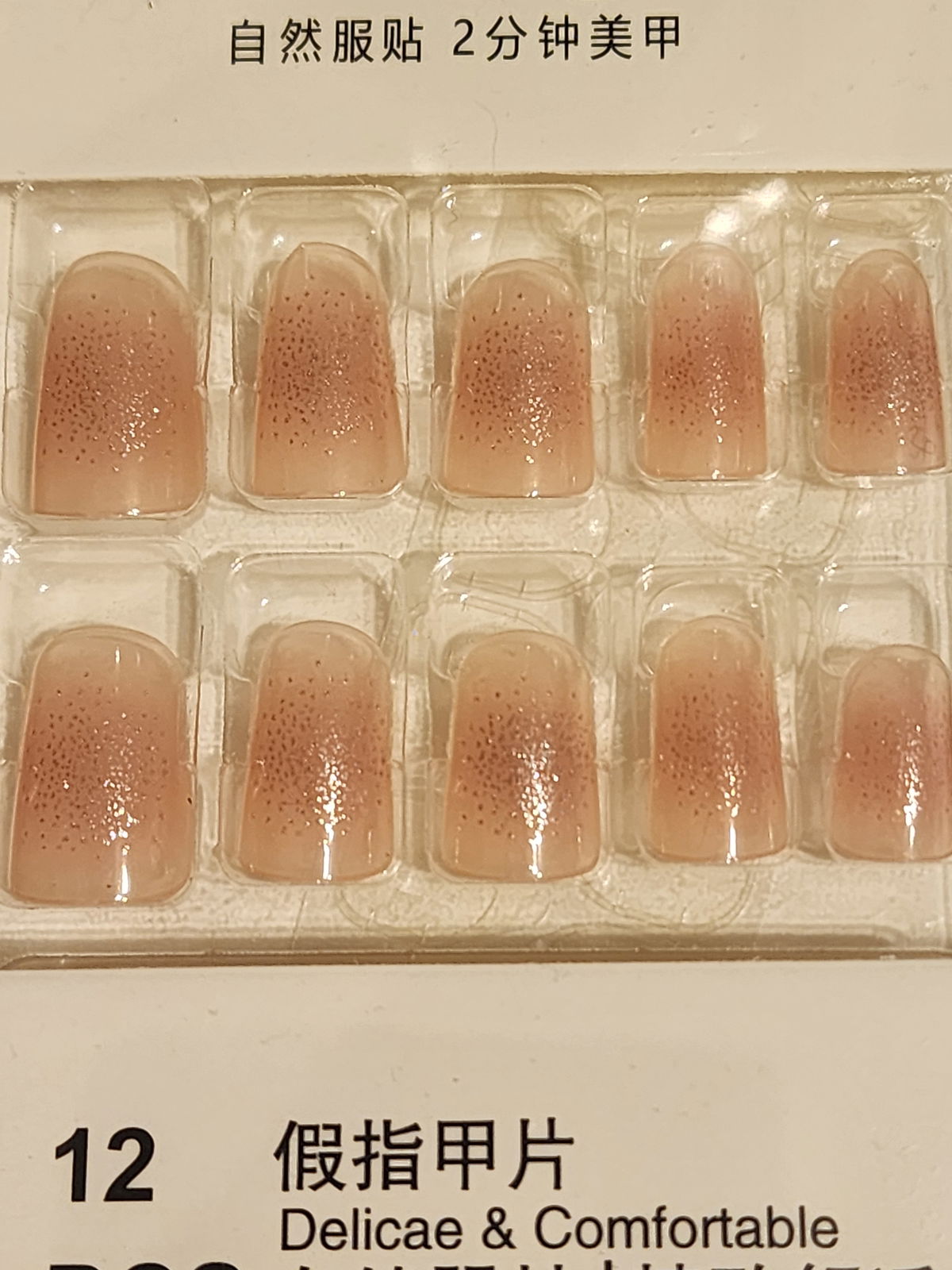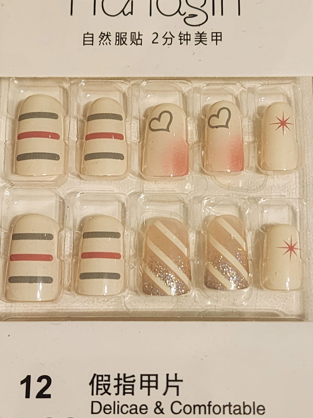 12 uñas de diferentes tamaños más una plancha de adhesivo