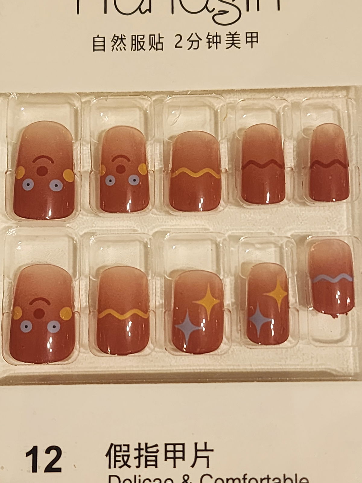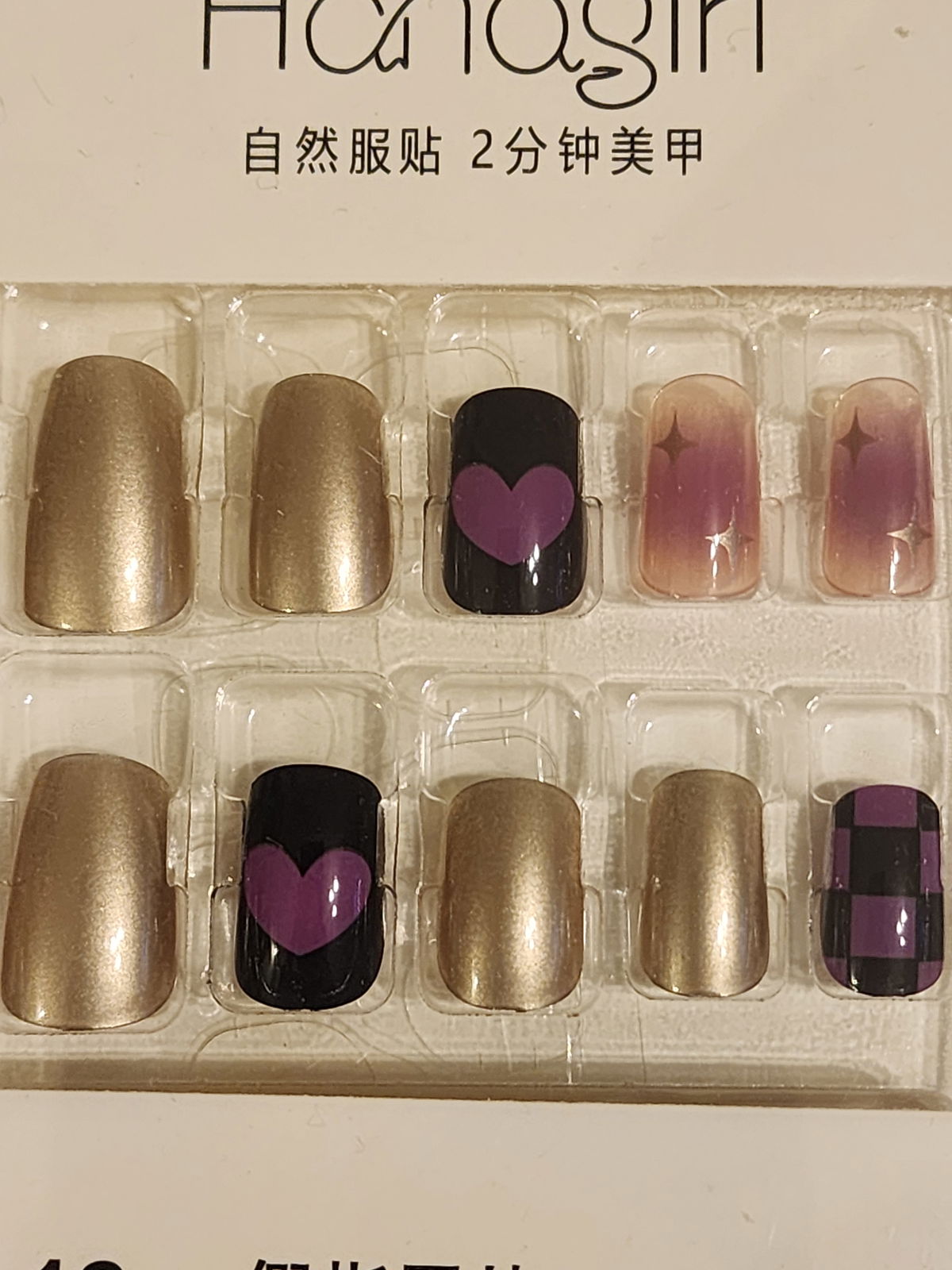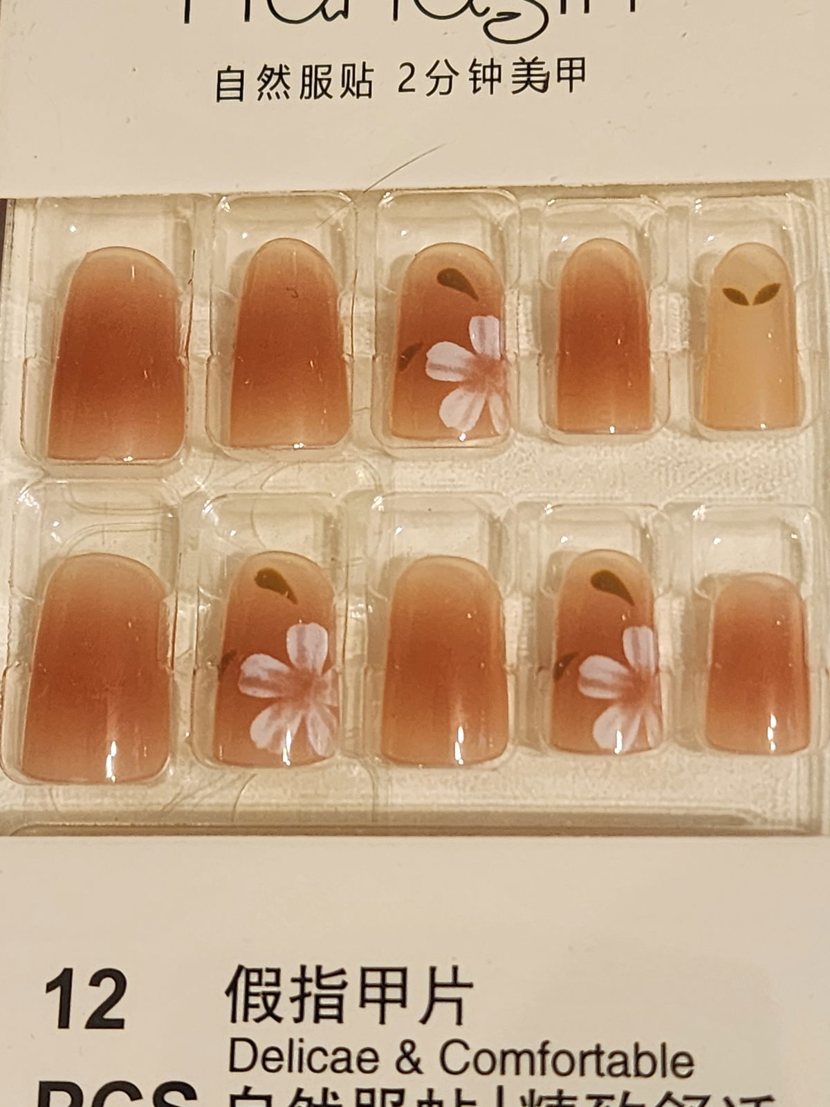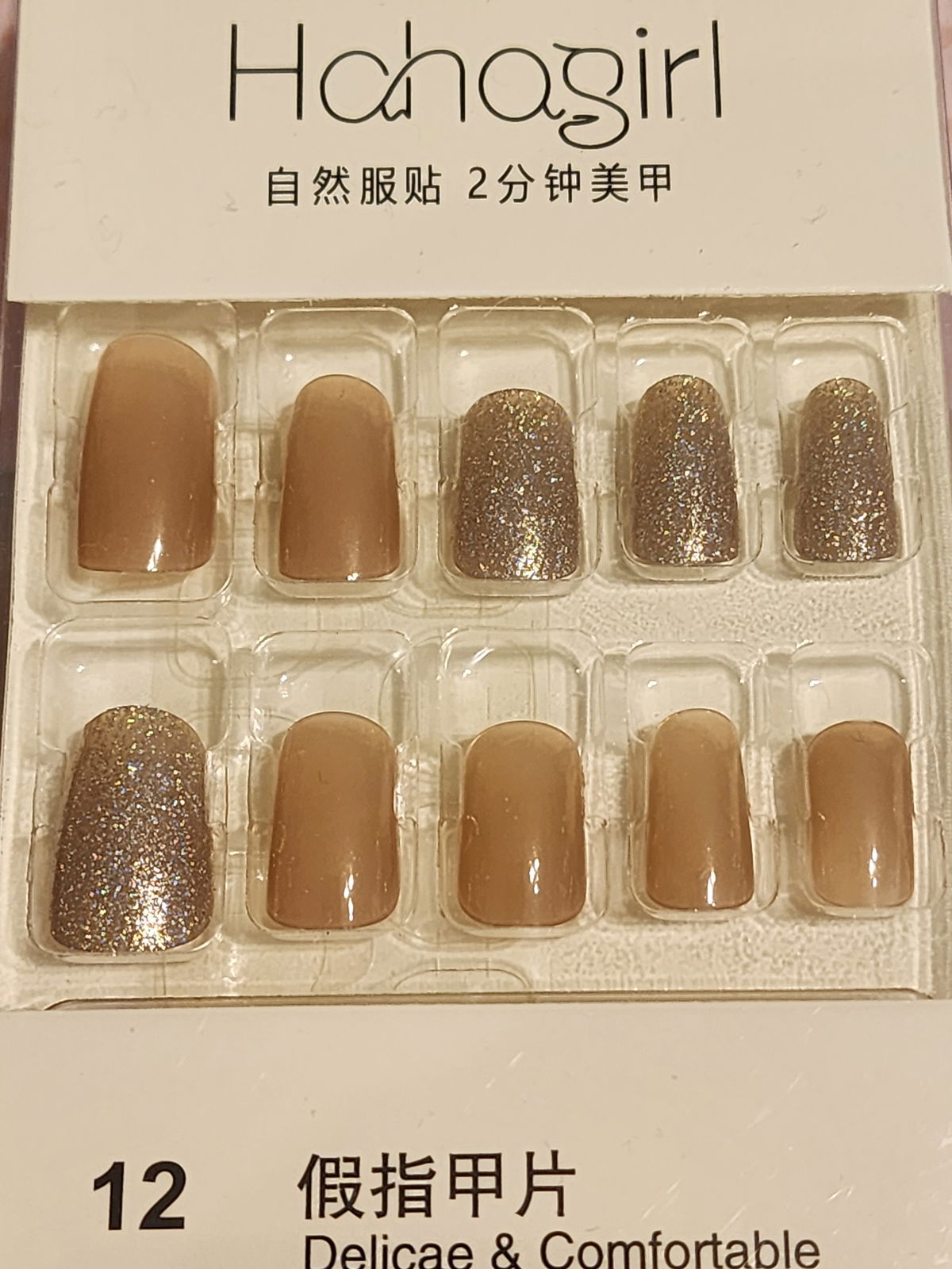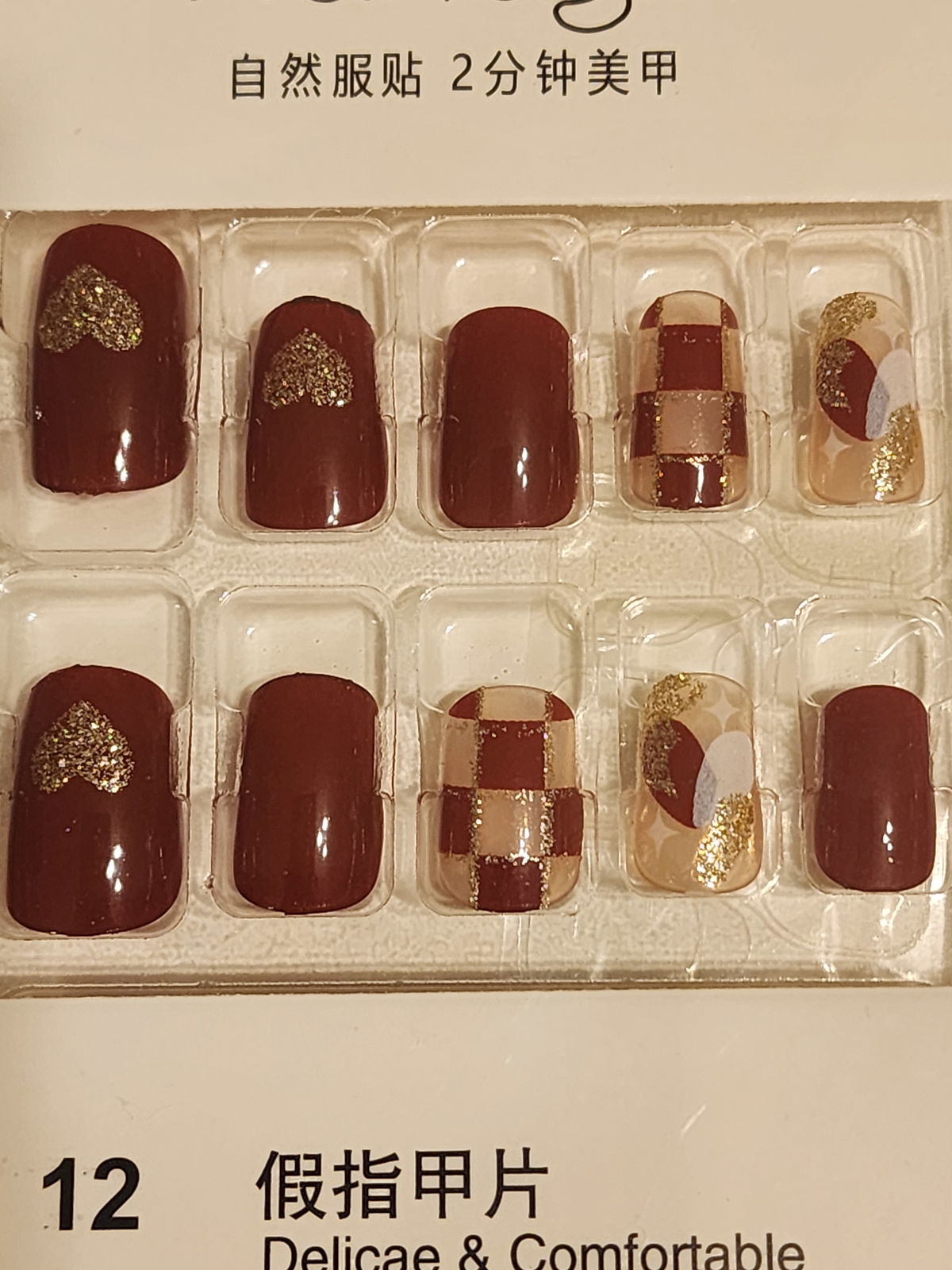 12 uñas de diferentes tamaños más una plancha de adhesivo