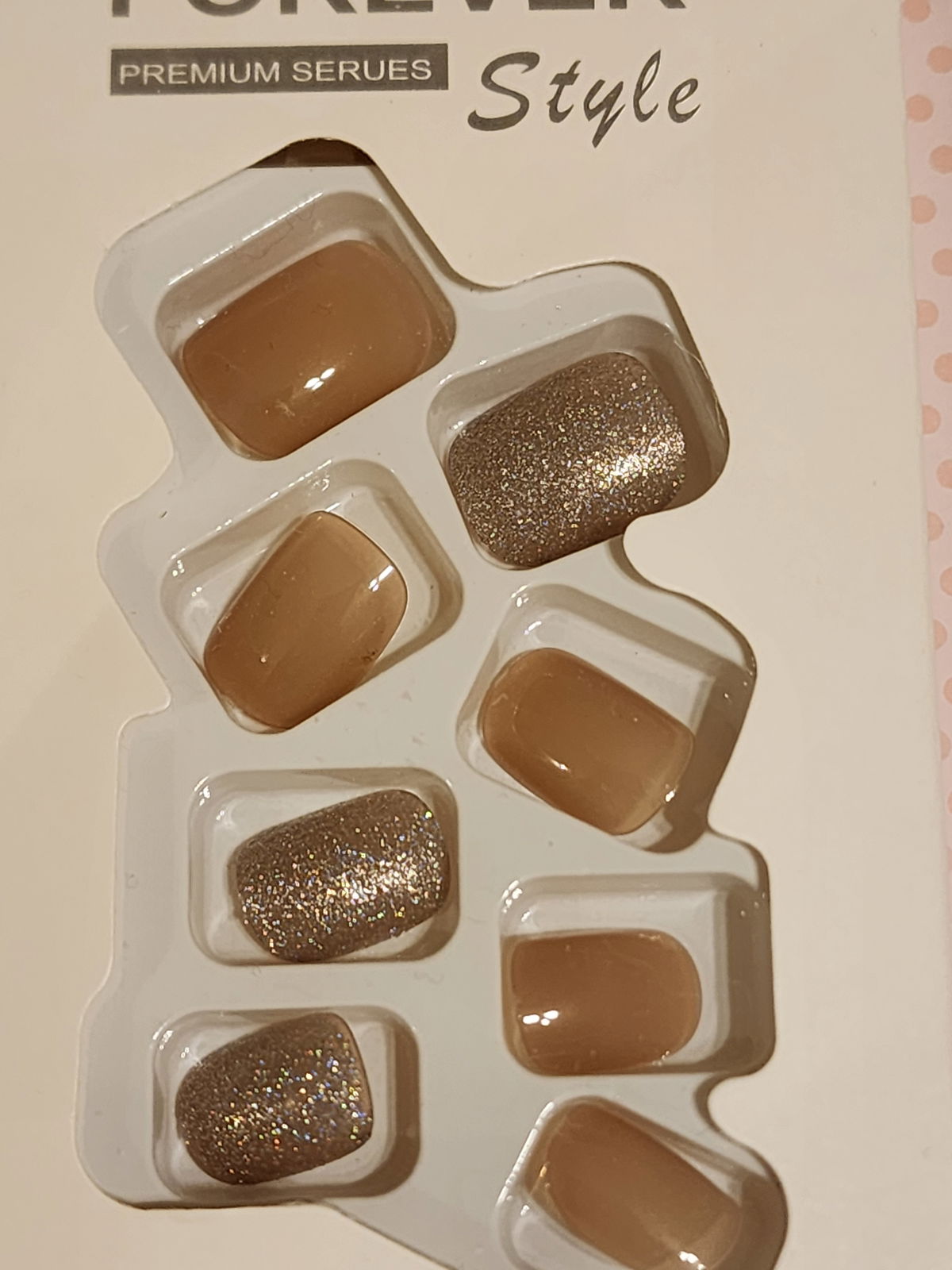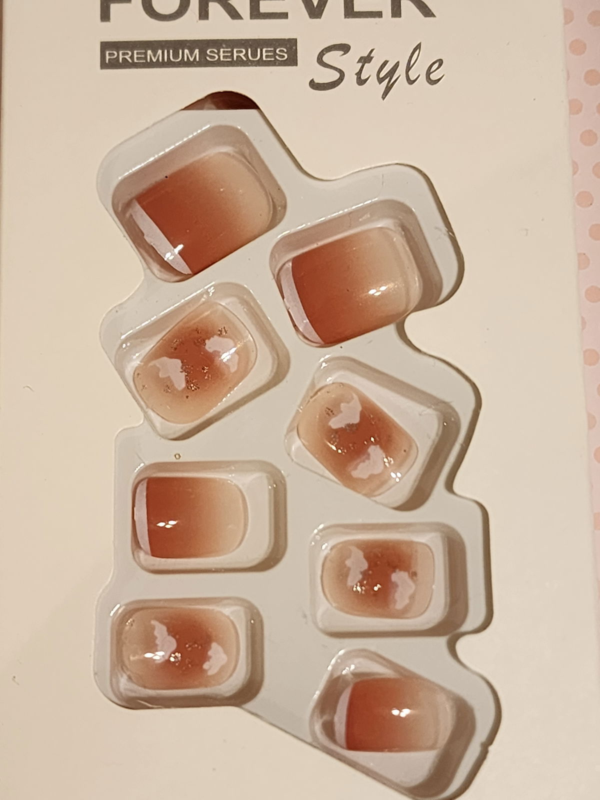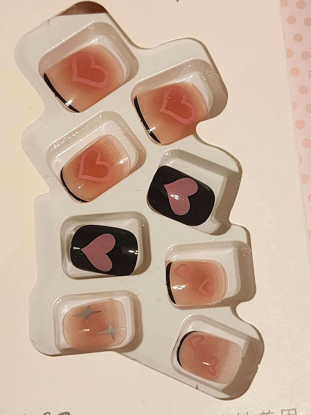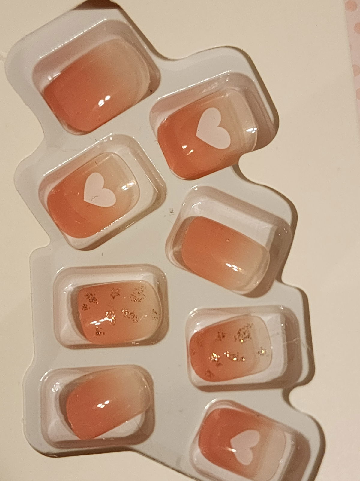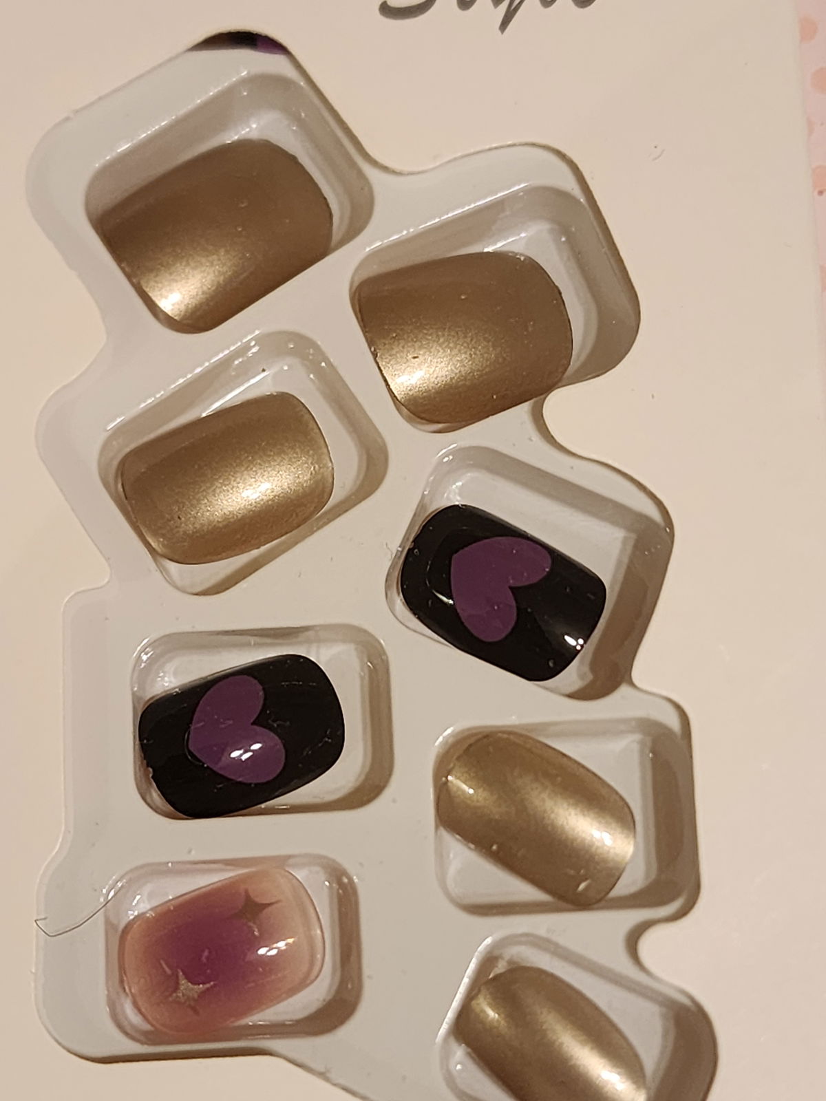 12 uñas de diferentes tamaños más una plancha de adhesivo