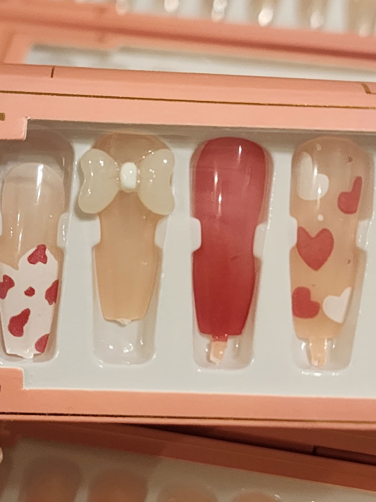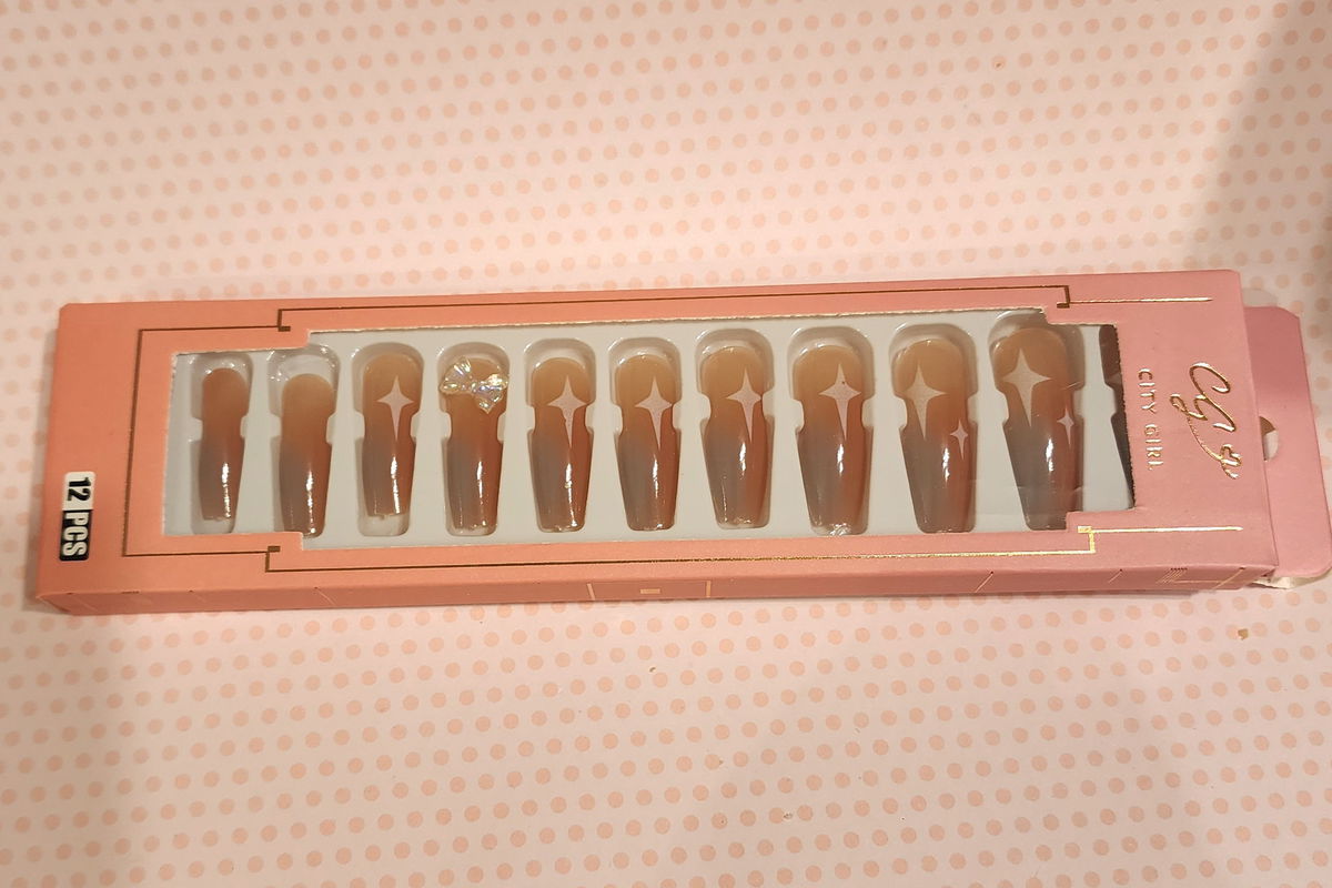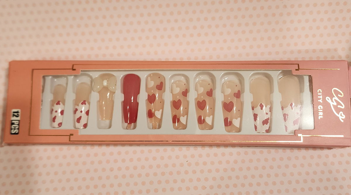 12 uñas de diferentes tamaños más una plancha de adhesivo